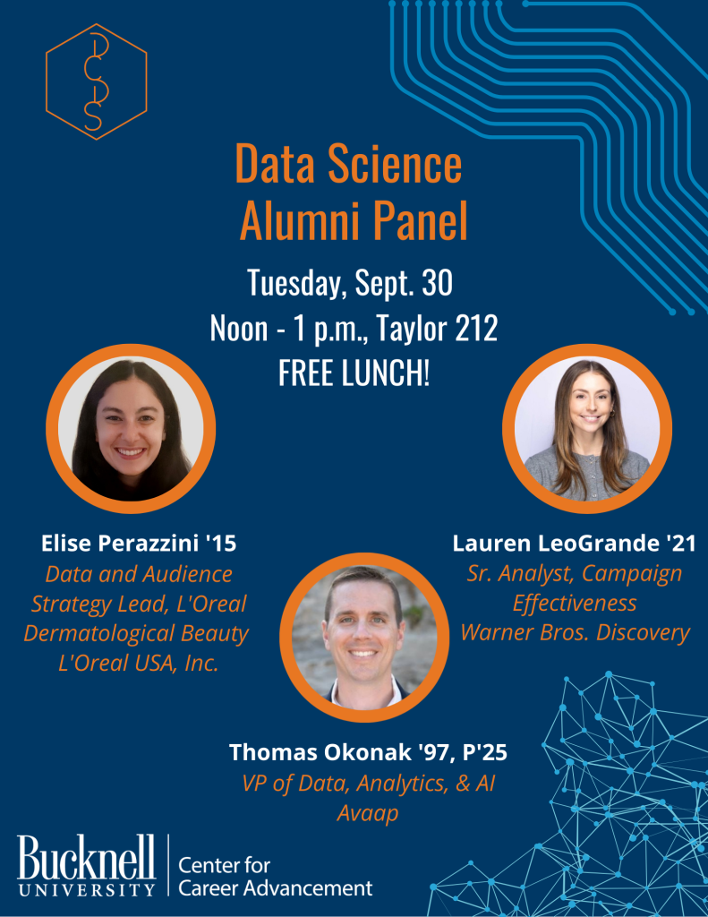 Three Bucknell alumni working in data-focused roles—Elise Perazinni ’15, Lauren LeoGrande ’21, and Thomas Okonak ’97—joined Professor Kelly McConville, Director of the Dominguez Center for Data Science, for a virtual panel discussion streamed to a packed classroom of Bucknellians. The conversation explored their career paths, the impact of their Bucknell education, and how artificial intelligence is transforming their work.